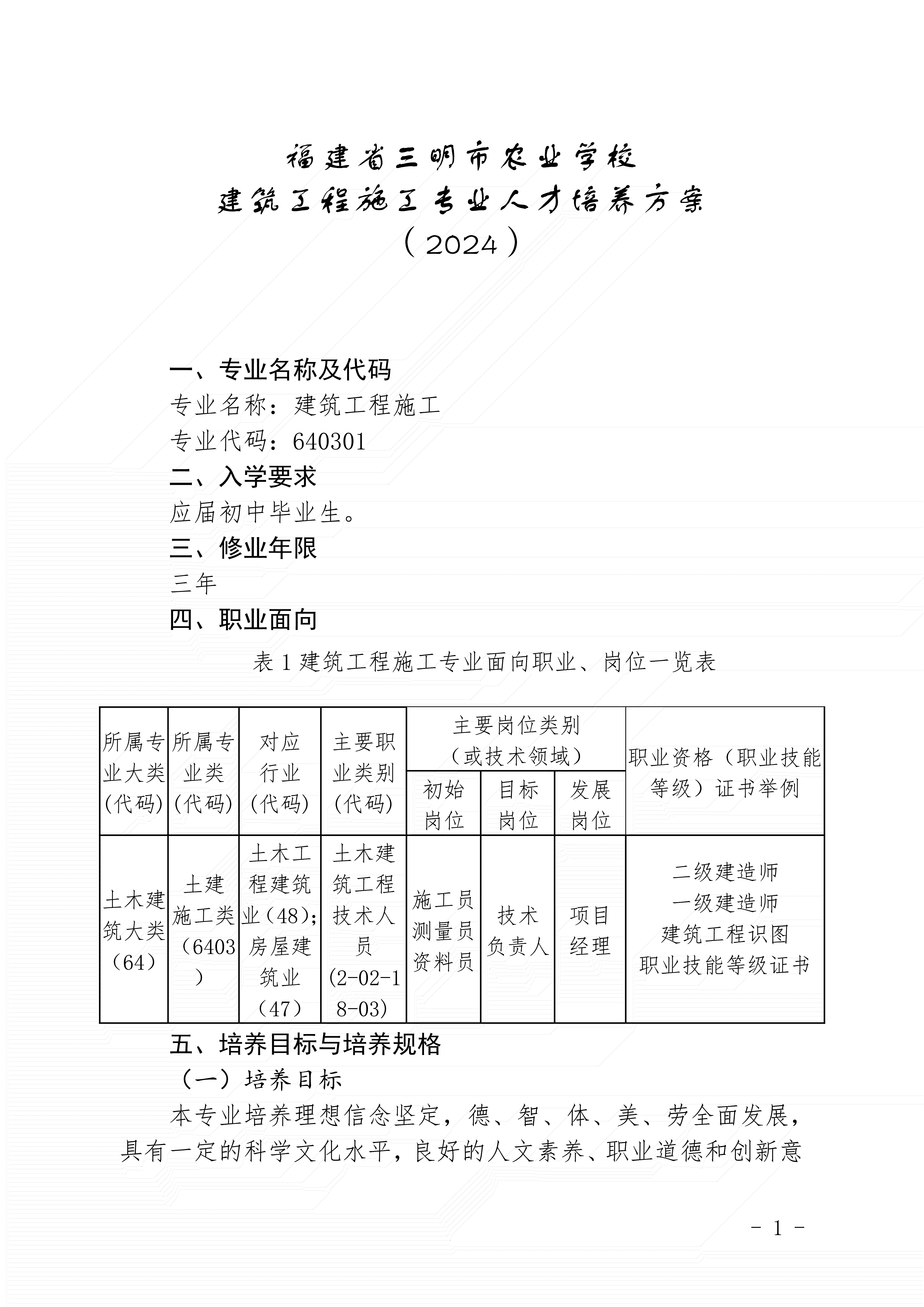 三明市农业学校建筑工程施工专业人才培养方案(2024)